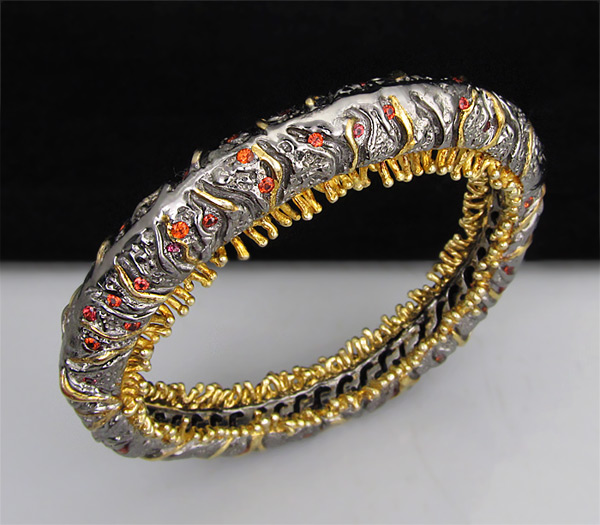 Браслет из черненого стерлингового серебра 925 пробы с сапфирами. Вес браслета — 67,3 гр. Площадка браслета — 76×13 мм. Выборочное золочение.