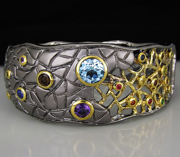 Браслет из черненого стерлингового серебра 925 пробы с аметистами, топазами, дымчатым кварцем, перидотами, разноцветными сапфирами, цаворитами, родолитами и мозамбкскими гранатами. Вес браслета — 60,5 гр. Площадка браслета — 73×28 мм. Выборочное золочение и матирование.