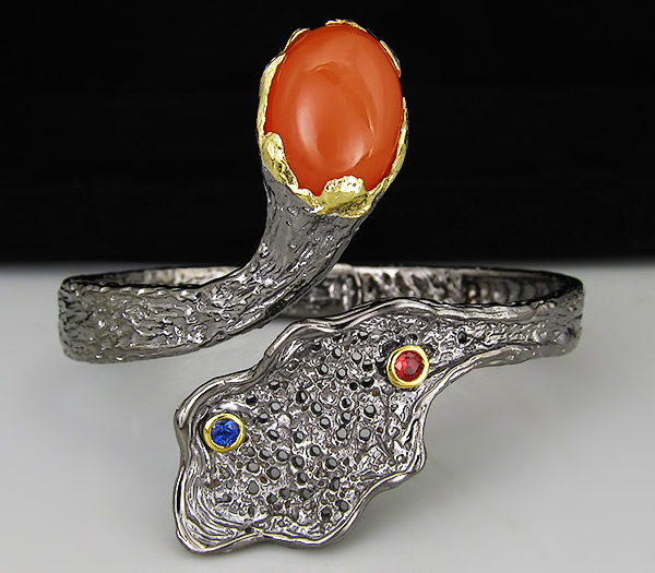 Браслет из черненого стерлингового серебра 925 пробы с корнелианом и сапфирами. Вес браслета — 47,6 гр. Площадка браслета — 66×53 мм. Выборочное золочение.