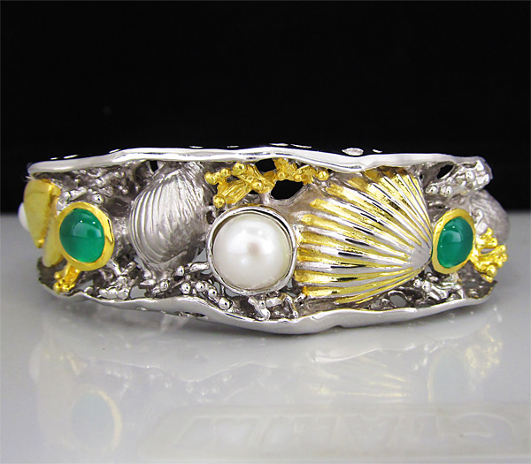 Браслет из стерлингового серебра 925 пробы с жемчужиной и зелеными агатами. Вес браслета — 57,7 гр. Площадка браслета — 79×24 мм. Выборочное золочение.