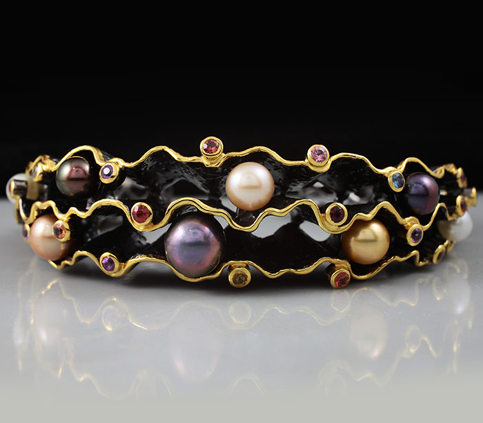 Браслет из черненого стерлингового серебра 925 пробы с разноцветными жемчугом и сапфирами. Вес браслета — 61,8 гр. Площадка браслета — 81×22 мм. Выборочное золочение.