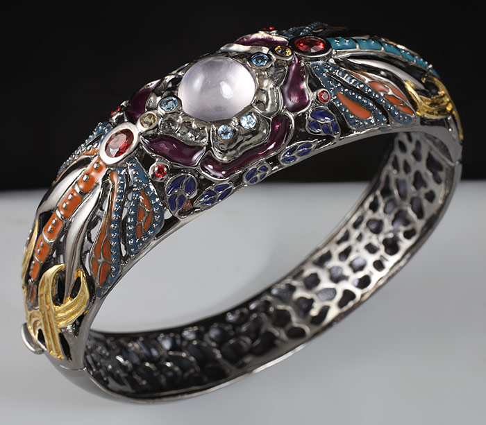 Браслет из черненого стерлингового серебра 925 пробы с розовым кварцем, топазами, цитринами и сапфирами. Вес браслета — 64 гр. Площадка браслета — 76×23 мм. Выборочное золочение и покрытие эмалью.