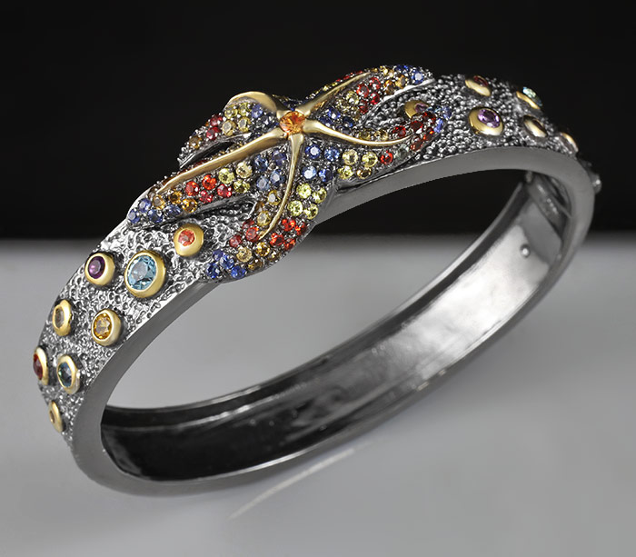 Браслет из черненого стерлингового серебра 925 пробы с цитринами, топазами, аметистами и разноцветными сапфирами. Вес браслета — 40 гр. Площадка браслета — 70×18 мм. Выборочное золочение.