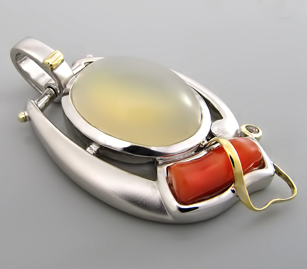 Кулон из родированного стерлингового серебра 925 пробы с лунным камнем, кораллом и бриллиантом. Выборочное матирование. Оправа бриллианта и декоративные элементы выполнены из золота 750 пробы. Размеры вставок от 2 мм до 22×16 мм. Размеры кулона с петлей 53×29 мм. Вес 24,1 гр.