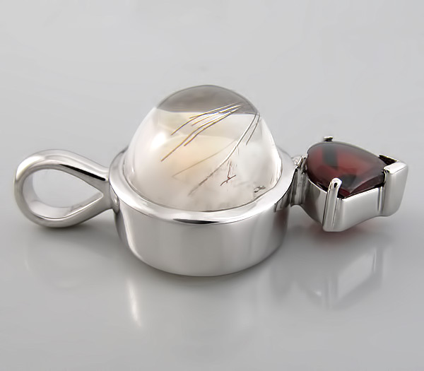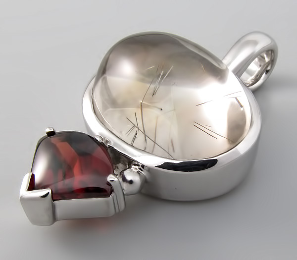 Кулон из родированного стерлингового серебра 925 пробы с рутиловым кварцем и ярким гранатом. Размеры вставок 11×8 мм и 20×15 мм. Площадка кулона 39×22 мм. Вес 13 гр.