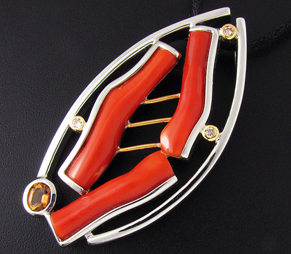 Вашему вниманию предлагается кулон из стерлингового серебра (925 проба) с ярко-красными кораллами, спессартином гранатом и 3 бриллиантами! Оправа бриллиантов и декоративные элементы изделия выполнены из золота 585 пробы. Площадка кулона 54 х 28 мм. Вес 25,9 г. Ниже приводятся размеры вставок.
