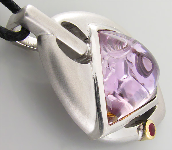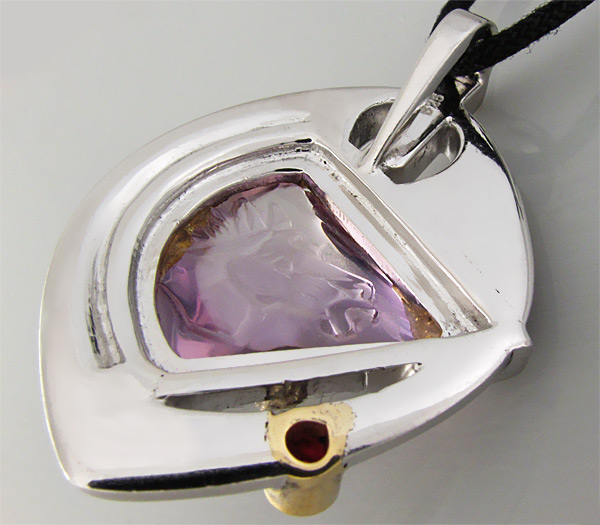 Вашему вниманию предлагается стильный кулон из стерлингового серебра (925 проба) с аметистом авторской огранки и пурпурным сапфиром! Оправа сапфира выполнена из золота 585 пробы. На тыльной поверхности аметиста вырезана голова лошади. Площадка кулона 42 х 27 мм. Вес 18,8 г. Ниже приводятся размеры вставок.