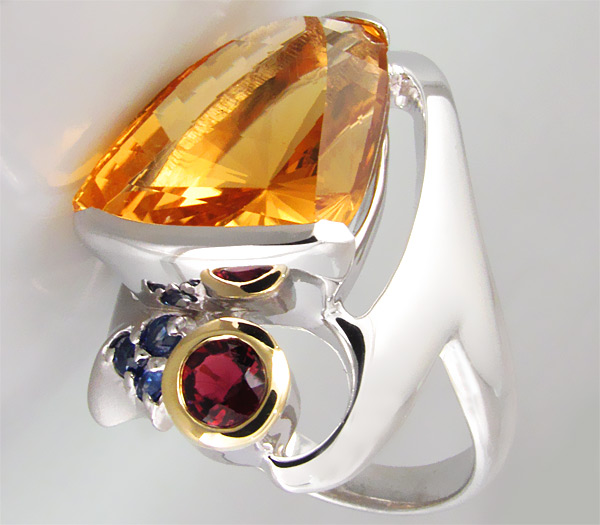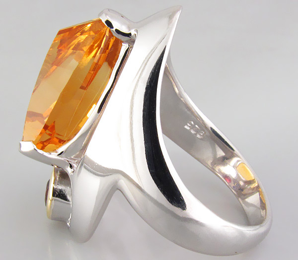 Вашему вниманию предлагается кольцо из стерлингового серебра (925 проба) с крупным золотистым цитрином авторской огранки, родолитом гранатом и тремя синими сапфирами! Изделие частично позолочено. Площадка 27 х 14 мм, высота 11 мм. Вес изделия 11 г. Размер 17,25. Ниже приводятся размеры вставок.