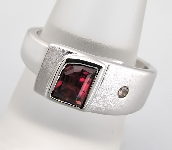 Вашему вниманию предлагается кольцо из стерлингового серебра (925 проба) с турмалином рубеллитом и бриллиантом цвета "шампань"! Изделие частично матировано. Размеры вставок 4 х 4 мм. Ширина площадки 8 мм, высота 7 мм. Вес изделия 8,9 г. Размер 18,5.