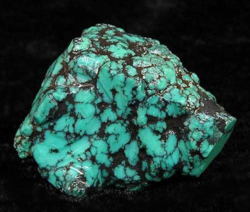 Скрытокристаллические плотные массы, прожилки, корочки, мелкие округлые вкрапления, округлые бугорчатые конкреции гроздьевидных форм. На срезе часто с характерными сетчатыми тонкими ветвящимися жилками черного или бурого цвета («паутинная бирюза»).