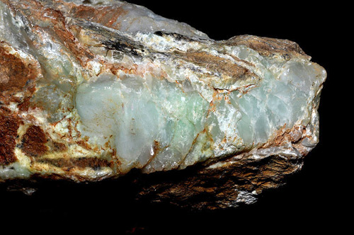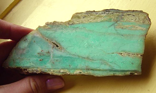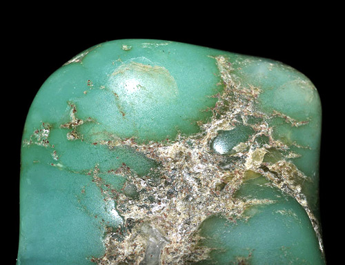 3. Хризопраз бледноокрашенный, пятнистый. Второй сорт — поделочный. Такой хризопраз, как правило, голубовато-зеленой или желто-зеленой окраски с неоднородной структурой. В окраске камня могут присутствовать молочно-белые пятна, а в структуре самого камня чередоваться участки просвечивающие и непрозрачные. Возможны включения окислов марганца, так называемые дендриты. На периферии камня могут присутствовать желтые или бурые включения лимонита.
