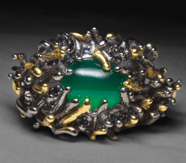 Кольцо из черненого стерлингового серебра 925 пробы с зеленым агатом (кабошон 12×8 мм) и синими сапфирами. Общая масса вставок 7,4 карат. Выборочное золочение. Площадка кольца — 35×22 мм, высота — 9 мм. Вес изделия — 23,9 гр.