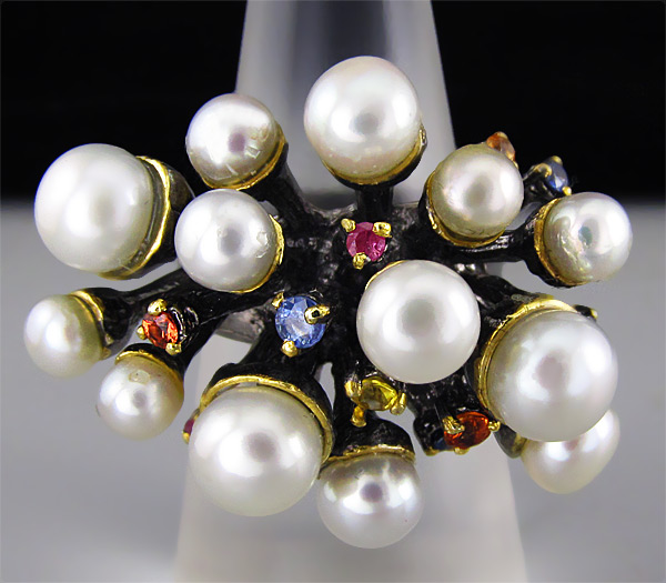Кольцо из черненого стерлингового серебра 925 пробы с жемчугом (3–5 мм) и разноцветными сапфирами. Выборочное золочение. Площадка кольца — 34×24 мм. Вес — 18,8 гр.