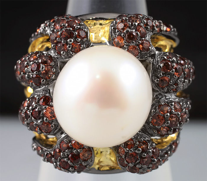 Кольцо из черненого стерлингового серебра 925 пробы с жемчугом и гранатами. Выборочное золочение. Площадка кольца — 24×21 мм. Вес — 18,3 гр.