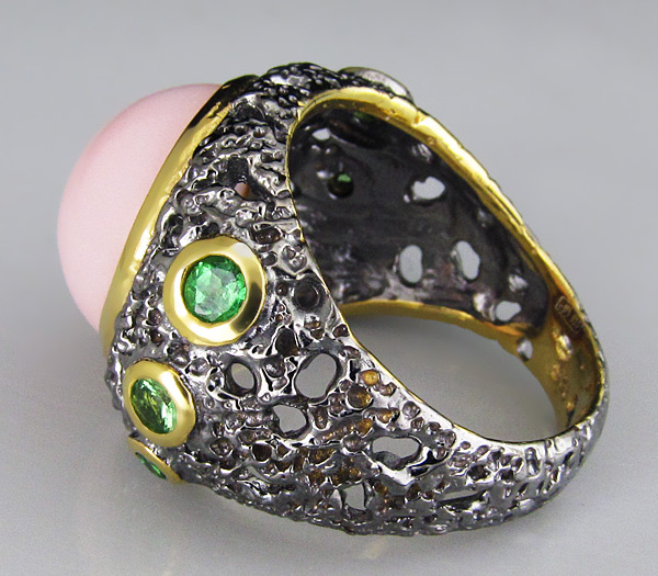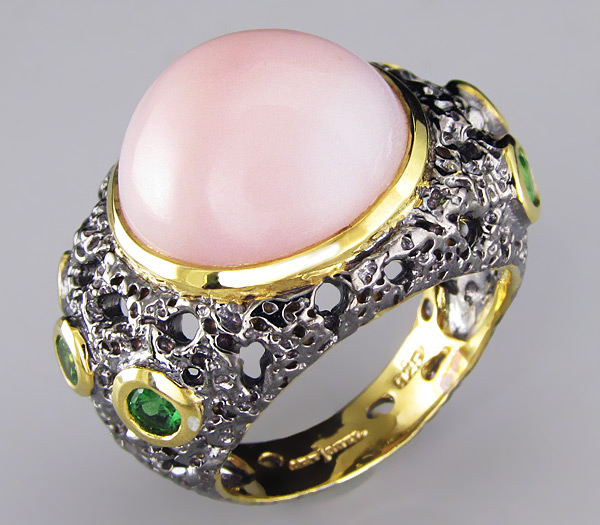 Кольцо из черненого стерлингового серебра 925 пробы с крупным розовым опалом и цаворитами. Выборочное золочение. Вес — 10,2 гр. Площадка кольца — 24×17 мм.