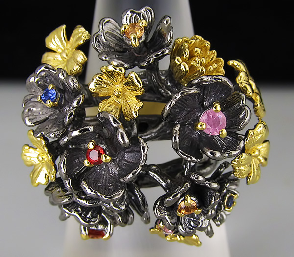Кольцо из черненого стерлингового серебра 925 пробы с разноцветными сапфирами. Выборочное золочение. Вес — 18,6 гр. Площадка кольца — 30×27 мм.