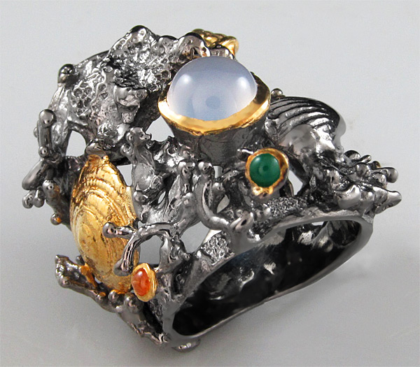 Кольцо из стерлингового черненого серебра 925 пробы с халцедоном (кабошон 8 мм), зеленым агатом и розовым кварцем. Выборочное золочение. Вес — 24,6 гр. Размер площадки — 35×24 мм.