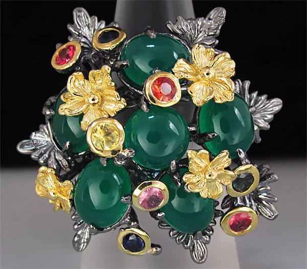 Кольцо из родированного стерлингового серебра 925 пробы с зеленым агатом (кабошоны 6×8 мм) и разноцветными сапфирами. Вес — 22,8 гр. Площадка кольца — 33×35 мм. Выборочное золочение.