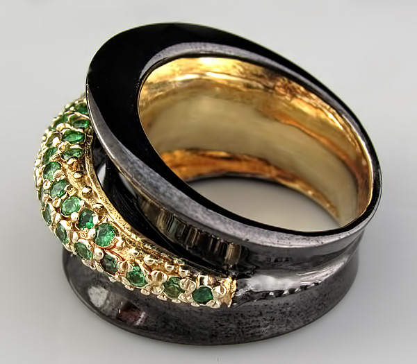 Кольцо из черненого стерлингового серебра 925 пробы с цаворитами гранатами. Вес — 14,4 гр. Площадка кольца — 26×25 мм. Выборочное золочение.