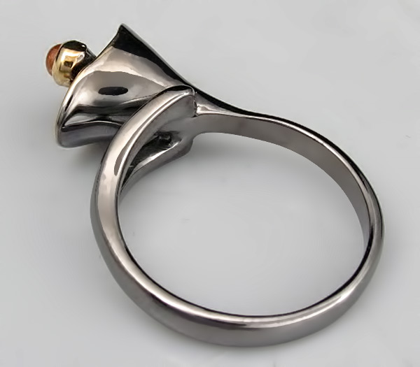 Кольцо из черненого стерлингового серебра 925 пробы с цитрином кабошоном (3 мм). Вес кольца — 3,4 гр. Площадка кольца — 10×8 мм. Выборочное золочение.