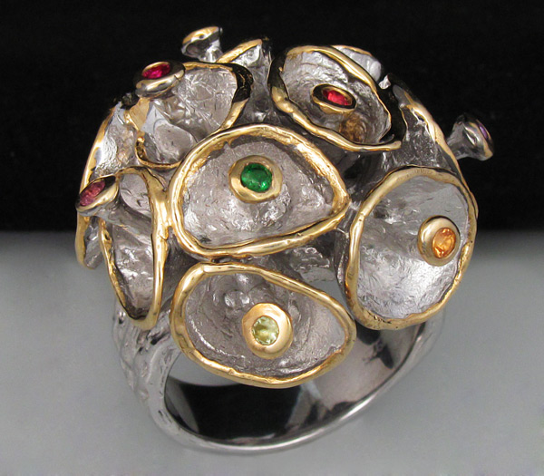 Кольцо из родированного матированного стерлингового серебра 925 пробы с сапфирами, перидотом, топазом, аметистом, цитрином, родолитом гранатом и цаворитом гранатом. Вес кольца — 24,9 гр. Площадка кольца — 29×27 мм. Выборочное золочение.