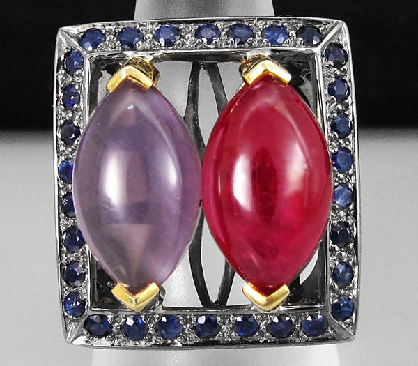 Кольцо из черненого стерлингового серебра 925 пробы с сапфирами, аметистом и гранатами. Размер центральных кабошонов (16×9мм). Вес кольца — 16,8 гр. Площадка кольца — 25×23 мм. Выборочное золочение и матирование.