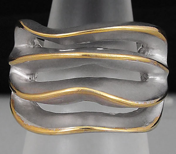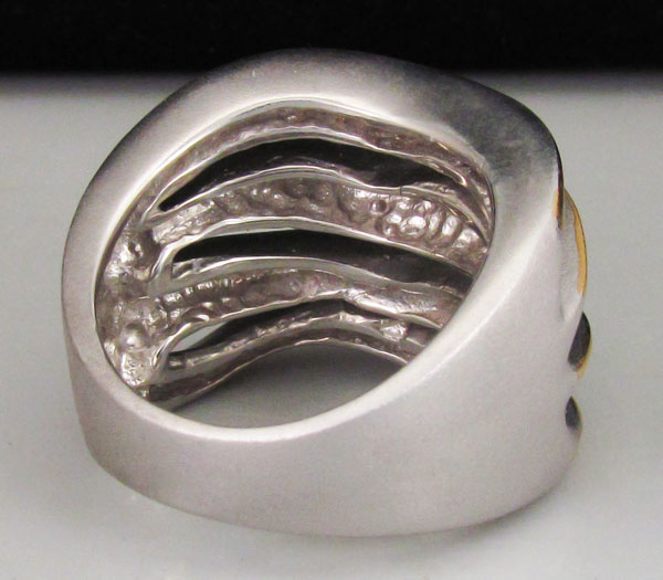 Кольцо из родированного матированного стерлингового серебра 925 пробы. Вес кольца — 13 гр. Площадка кольца — 24×16 мм. Выборочное золочение.