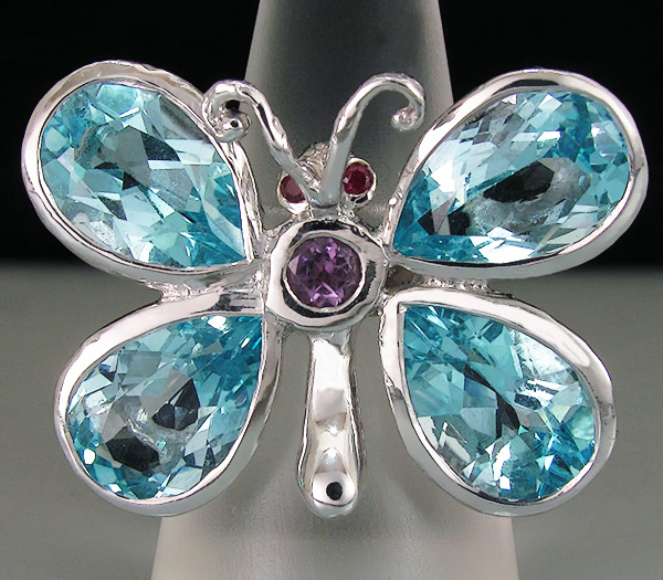 Кольцо из родированного стерлингового серебра 925 пробы с топазами (капля 14×9 мм), аметистом и сапфирами. Вес кольца — 15,6 гр. Площадка кольца — 34×25 мм.