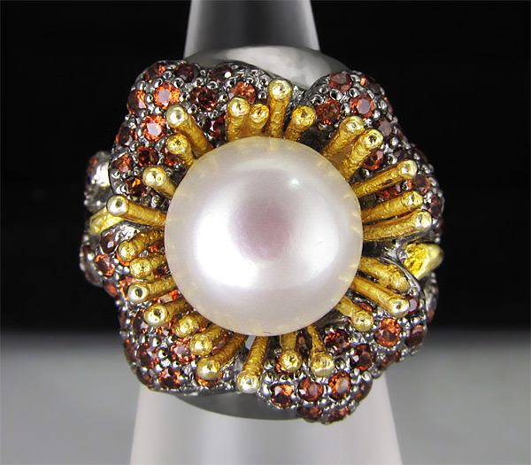 Кольцо из черненого стерлингового серебра 925 пробы с жемчугом и гранатами. Вес кольца — 17,4 гр. Площадка кольца — 27×25 мм. Выборочное золочение.