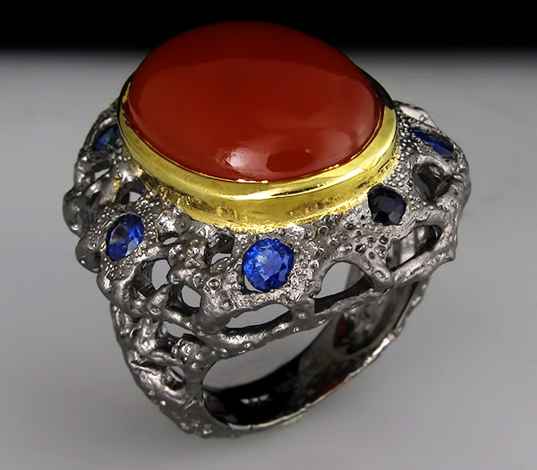 Кольцо из черненого стерлингового серебра 925 пробы с корнелианом и сапфирами. Вес кольца — 14,3 гр. Площадка кольца — 27×25 мм. Выборочное золочение.