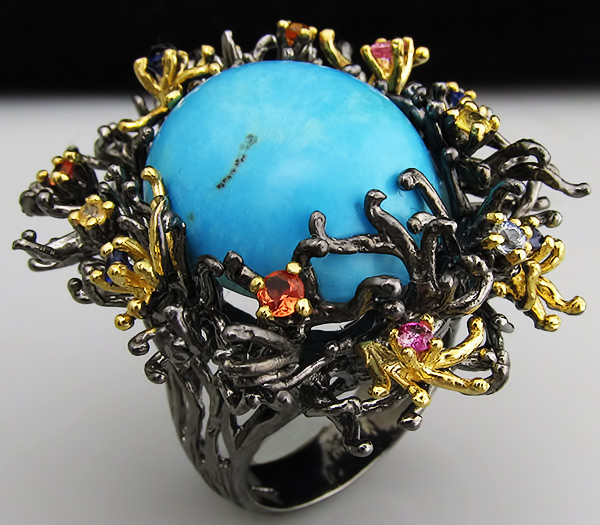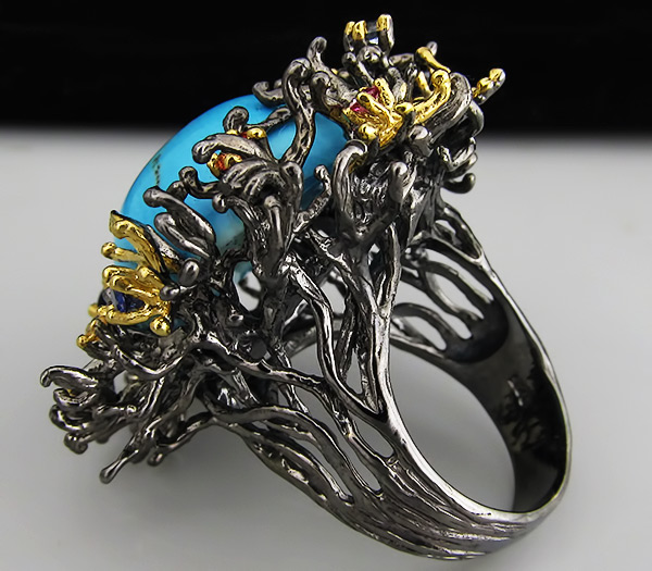 Кольцо из черненого стерлингового серебра 925 пробы с амазонитом, топазами и сапфирами. Вес кольца — 20,6 . Площадка кольца — 33×32 мм. Выборочное золочение.