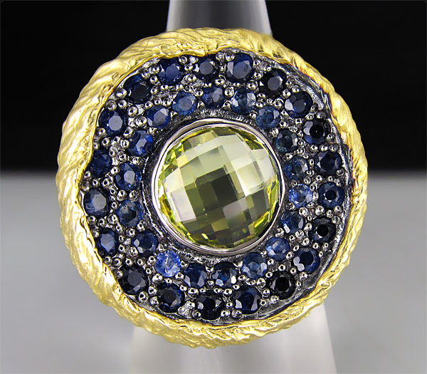 Кольцо из черненого стерлингового серебра 925 пробы с цитрином, родолитами гранатами и сапфирами. Вес кольца — 22,5 гр. Площадка кольца — 28×27 мм. Выборочное золочение.