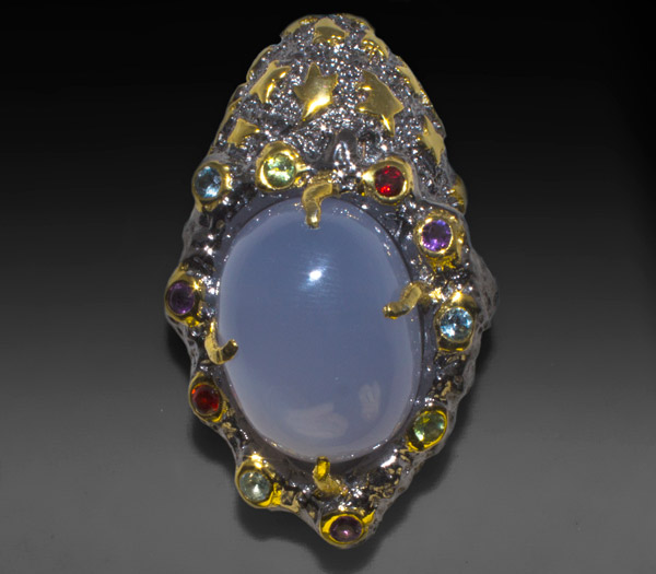 Кулон из черненого стерлингового серебра 925 пробы с халцедоном (кабошон 20×15 мм), гранатами, перидотами, аметистами и голубыми топазами. Общая масса вставок 24,05 карат. Выборочное золочение. Размер кулона — 42×26 мм. Вес — 19,1 гр.