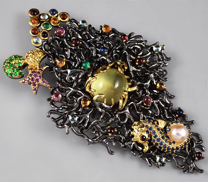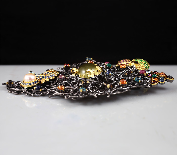 Серебро 925, Золочение, ЧернениеИнкрустация: Аметист, Гранат, Жемчуг, Сапфир, Турмалин, Цаворит гранат, ЦитринВес изделия: 46,2 граммРазмер: 95×53 мм