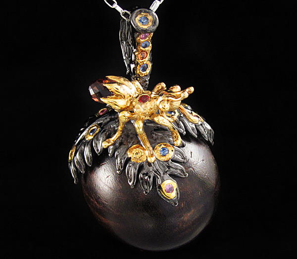 Скульптурный кулон из черненого стерлингового серебра 925 пробы с сапфирами и шара из экзотического дерева Sono (25 мм). Вес — 10,46 гр. Размер кулона — 45×25 мм. Мини-скульптура муравья позолочена.