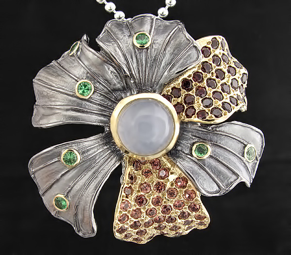 Кулон из черненого матированого серебра 925 пробы с халцедоном (кабошон 10 мм), гранатами и цаворит гранатами. Вес — 26,5 гр. Размер кулона — 43×45 мм. Выборочное золочение.