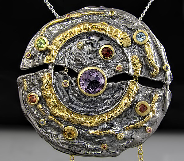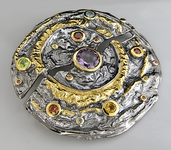 Кулон из черненого стерлингового серебра 925 пробы с аметистом (10 мм), оранжевыми цирконами, цитрином, топазом, перидотом и разноцветными сапфирами. Вес — 42,3 гр. Размер кулона — 62×61 мм. Выборочное золочение.