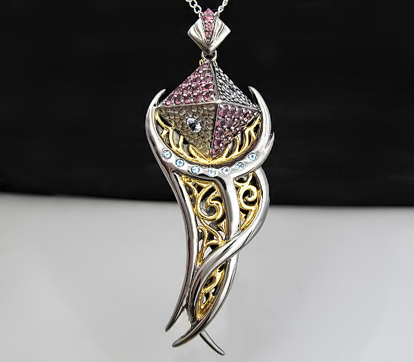 Кулон из черненого стерлингового серебра 925 пробы с родолитами гранатами и топазами. Вес — 33,85 гр. Размер кулона — 91×34 мм. Выборочное золочение.