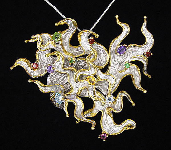 Кулон из стерлингового серебра 925 пробы с родолитом, цаворитами и мозамбикскими гранатами, аметистами, цитрином, топазами и перидотом. Вес — 23,6 гр. Размер кулона — 61×55 мм. Выборочное золочение.