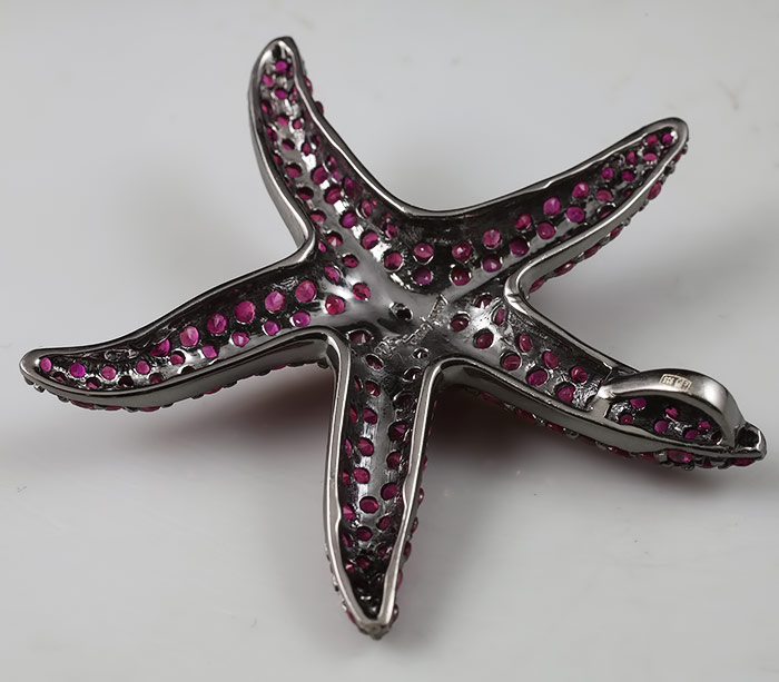 Кулон из черненого стерлингового серебра 925 пробы с пурпурными сапфирами. Вес — 10,6 гр. Размер кулона — 47×44 мм. Выборочное золочение