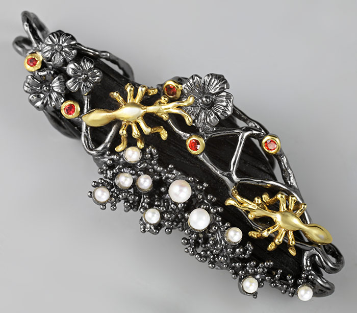 Серебро 925, Золочение, ЧернениеИнкрустация: Жемчуг, Сапфир, ДревесинаВес изделия: 18,6 граммРазмер: 67×27 мм