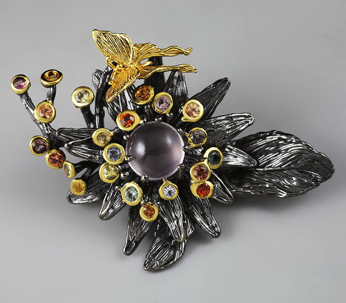 Брошь/кулон из черненого стерлингового серебра 925 пробы с розовым кварцем и разноцветными сапфирами. Выборочное золочение.
