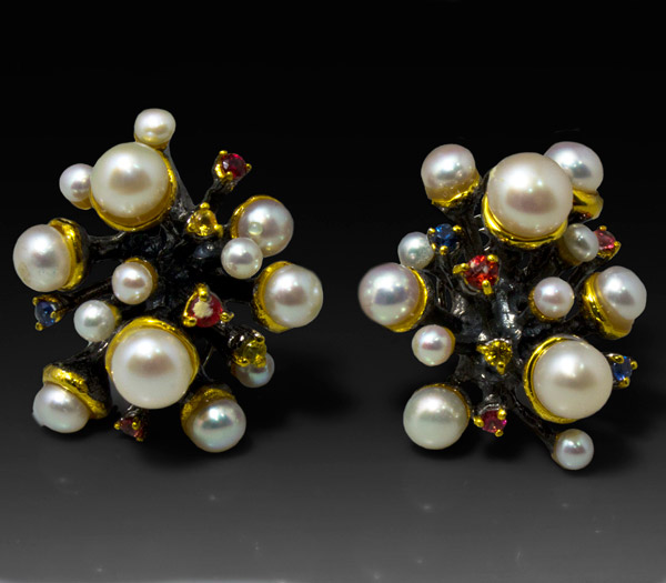 Серьги из черненого стерлингового серебра 925 пробы с жемчугом (3–5 мм) и разноцветными сапфирами. Выборочное золочение. Вес — 18,7 гр. Размер серег — 25×23 мм.