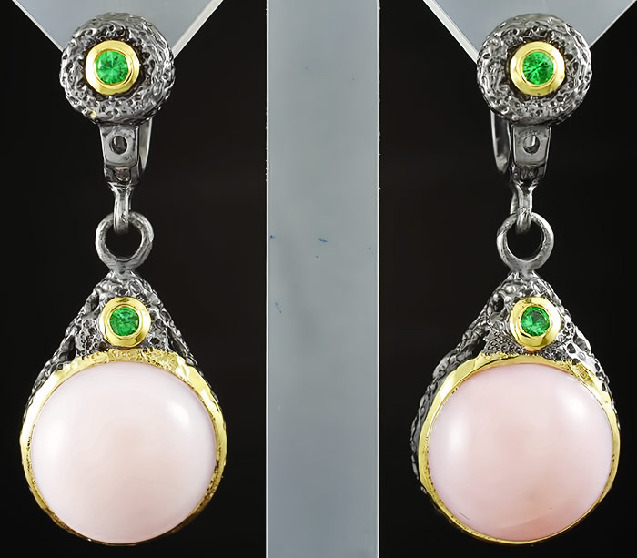 Серьги из черненого стерлингового серебра 925 пробы с крупными розовыми опалами и цаворитами. Выборочное золочение. Вес — 9,5 гр. Размер серег — 34×14 мм.