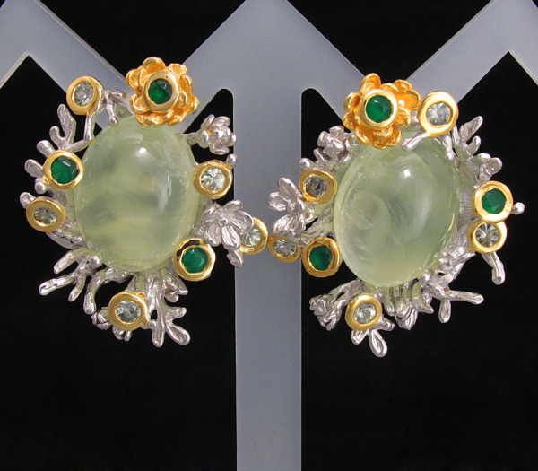 Серьги из родированного стерлингового серебра 925 пробы с пренитами (кабошоны 18×13 мм), зелеными агатами и сапфирами. Вес — 24,4 гр. Размер серег — 33×29 мм. Выборочное золочение.