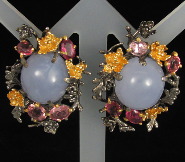 Серьги из черненого стерлингового серебра 925 пробы с кабошонами халцедона (15мм) и турмалинами. Вес — 19,8 гр. Размер серег — 32×24 мм. Выборочное золочение.