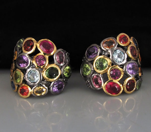 Серьги из черненого стерлингового серебра 925 пробы с турмалинами, мозамбикскими гранатами и родолитами гранатами, топазами, аметистами, перидотами и разноцветными сапфирами. Вес — 12,9 гр. Размер серег — 22×19 мм. Выборочное золочение.