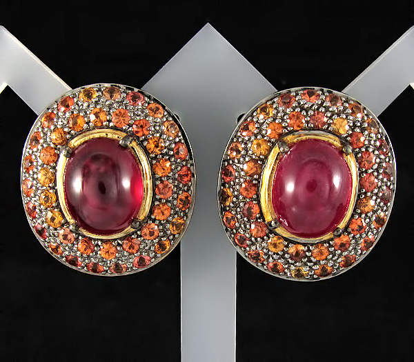Серьги из черненого стерлингового серебра 925 пробы с сапфирами. Вес — 23,4 гр. Размер серег — 27×24 мм. Размер центральной вставки 10×13 мм (кабошон). Выборочное золочение.