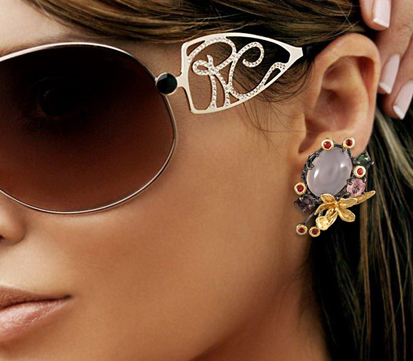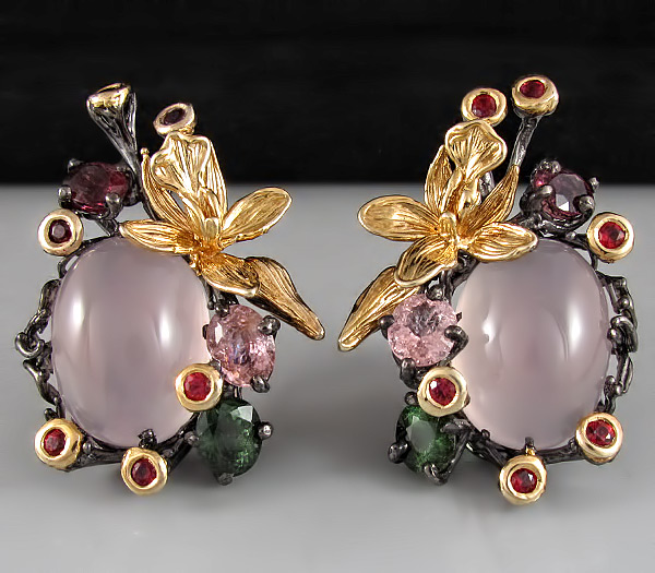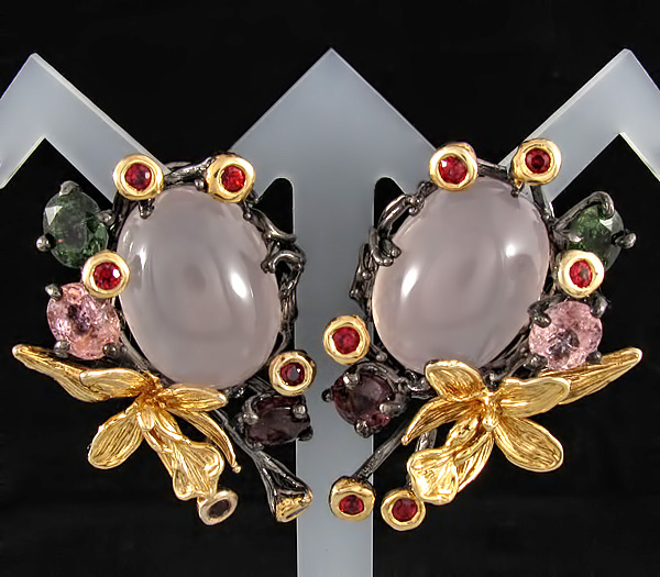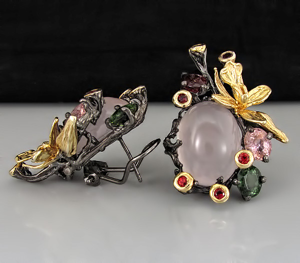 Серьги из черненого стерлингового серебра 925 пробы с розовыми кварцами кабошонами (14×20 мм) и разноцветными сапфирами. Вес — 31,5 гр. Размер серег — 41×29 мм. Выборочное золочение.