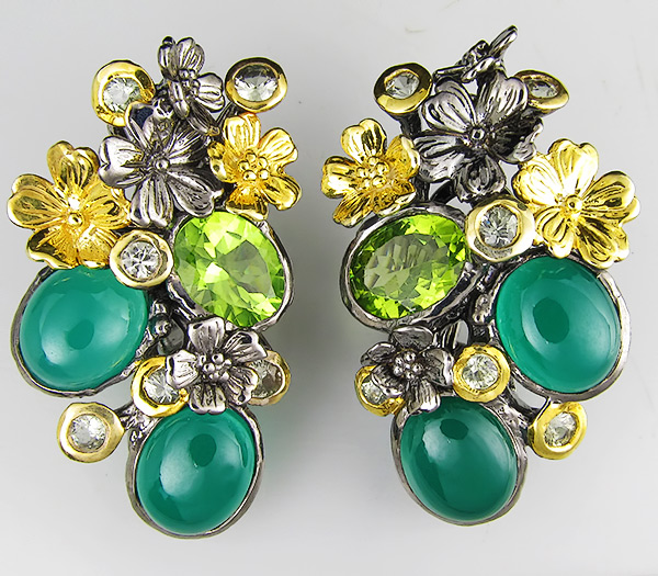 Серьги из черненого стерлингового серебра 925 пробы с зелеными агатами, перидотами и сапфирами. Вес — 23,9 гр. Размер серег — 38×29 мм. Выборочное золочение.